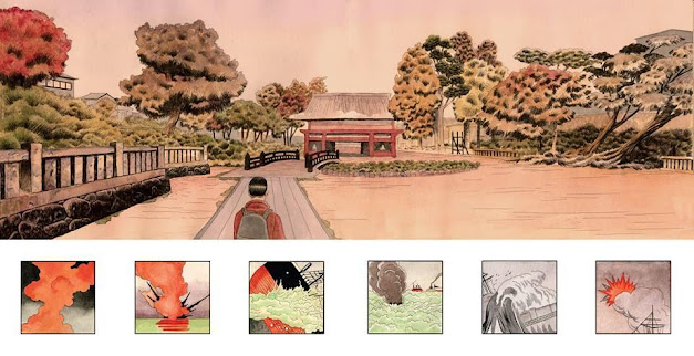 Nonostante una Tokyo – con tutte le sue problematiche – vicina alle olimpiadi e prossima a diventare una delle tante metropoli senza anima, questo è un vero e proprio atto d’amore per il Giappone in toto, che da qualche parte conserva ancora intatto lo spirito Zen. Tuttavia si percepisce anche una certa idealizzazione, viene ritratto un Giappone troppo bucolico, nonostante gli accenni alla modernità; lo sguardo è palesemente di uno che ama quei posti. Ecco, sì, è un po' di parte ma credo che alla fine quello sia lo stato d'animo di Igort che non viene trattato come un normale gaijin né come un normale giapponese, ma gli viene riservato un posto d'eccezione durante il lavoro e in Giappone non è poco. Raccontare le cose semplici ed esserne soddisfatti - contemplare - è proprio l’approccio Zen che Igort porta avanti tramite una tecnica mista tra fotografie e pennellate, mutevole ma sempre coerente, anche quando è dettagliato è minimalista.